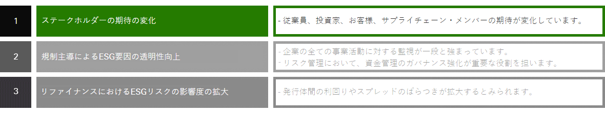 企業のサステナビリティへの取り組みが一段と重視される中、資金管理を通じて、いかにサステナビリティ目標達成に貢献できるかという問いがあります。当社は以下が重要なテーマであると考えます。